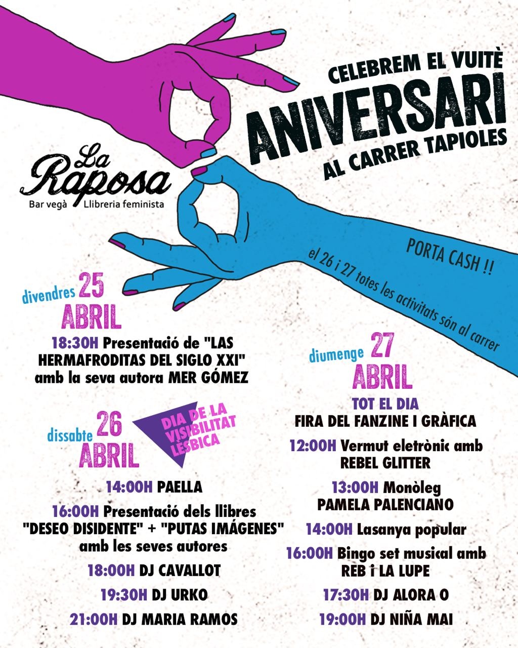 🌈 - Un año más tenemos ganas de celebrar por todo lo alto nuestro 8º cumpleaños con vosotres. Empezamos con una presentación el viernes en La Raposa para arrancar con dos dias de festejos, música, libros, ferias, un monólogo, bingo, comida deliciosa y brindis para juntarnos todes en la calle Tapioles.