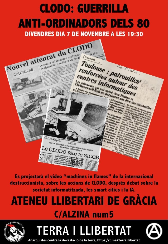 CLODO va ser un grup d’acció anti-ordinador que va estar actiu entre finals de 1979 i 1983, malgrat fer als voltant de 12 accions reivindicades… la policia mai els va poder capturar i la seva identitat no ha estat revelada. Ens queden els seus comunicats, especialment la seva “autoentrevista” (la pots consultar a https://t.me/Terraillibertat/885, https://t.me/Terraillibertat/886 )