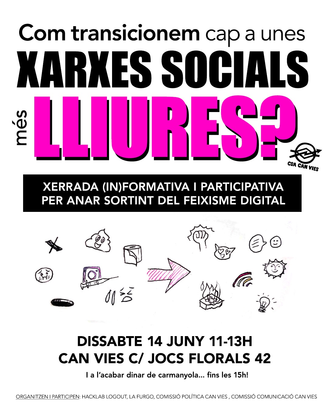 Des de Hacklab, la Furgo i les Comissions de Comunicació i Política de Can Vies, organitzem una xerrada participativa sobre com podem transicionar cap a unes xarxes socials més lliures.