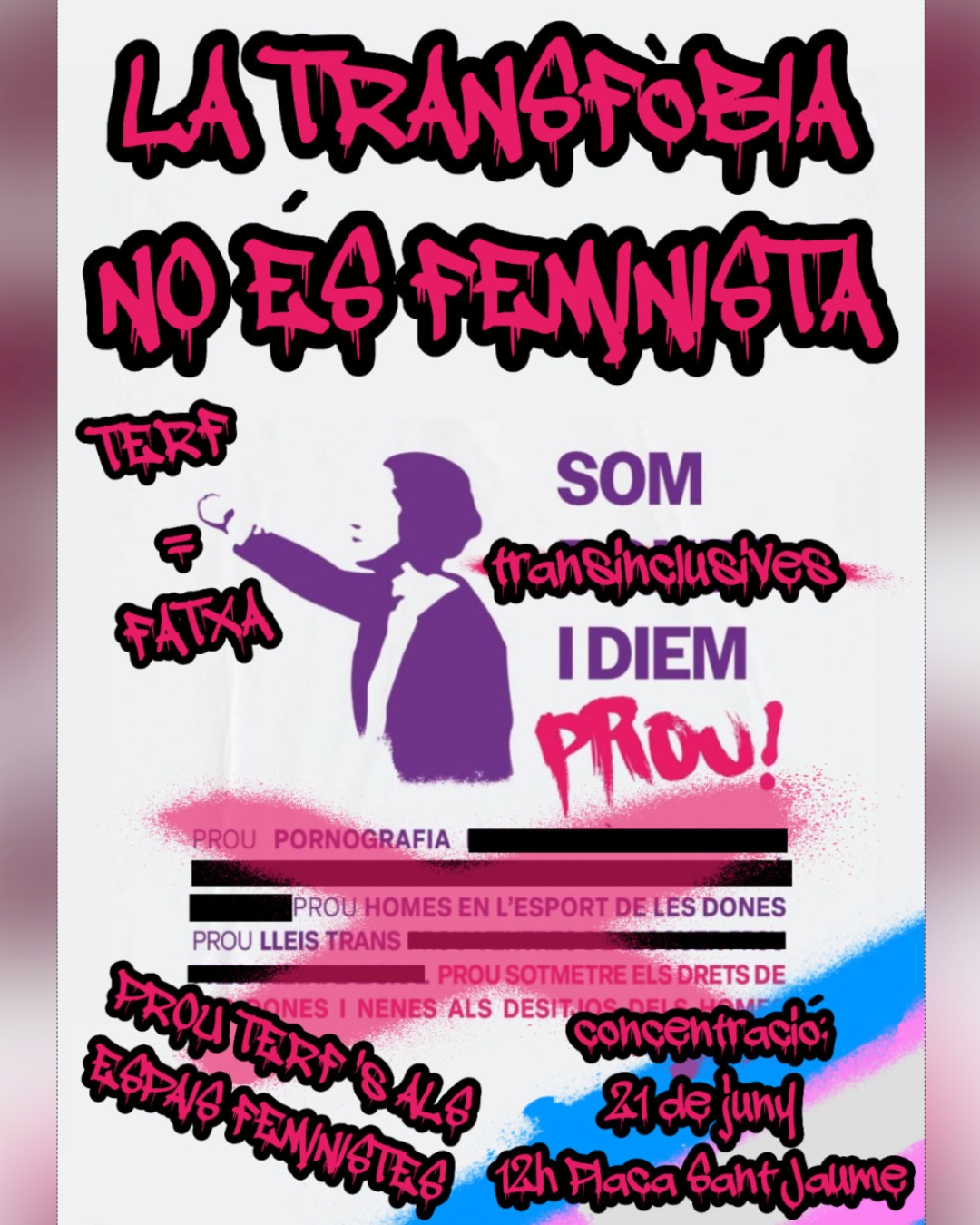 Convoca Confluència Moviment Feminista (sic), de complicitat entre Moviment Feminista (sic) de Barcelona i de Feministes (sic) de Catalunya. Frenarem el seu odi. Els direm que les nostres vides valen igual que les seves. Que els drets trans són drets feministes. Que la transfòbia no és feminista. Que estem fartis del seu feminisme blanc trànsfob, racista, lgtbiaqfòbic, capacitista, colonial, imperialista, sionista, contra lis treballadoris sexuals, grassòfob i classista.