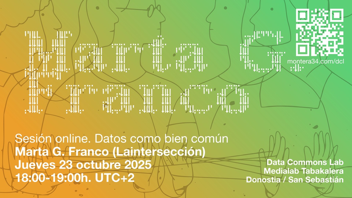 Este jueves 23 de octubre a las 18:00h tenemos la tercera conversación de "Datos como bien común" con Marta G. Franco (Laintersección) como invitada, dentro del laboratorio ciudadano Data Commons Lab, con base de Medialab, Tabakalera (San Sebastián/ Donostia).