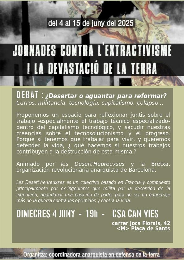 Les Desert'heureuxses es un colectivo basado en Francia y compuesto principalmente por ex-ingenieres que milita por la deserción de la ingeniería, abandonar una posición de poder para no ser un engrenaje más de la guerra contra les oprimides y contra la vida.