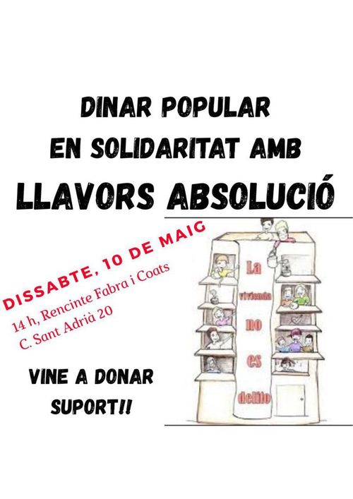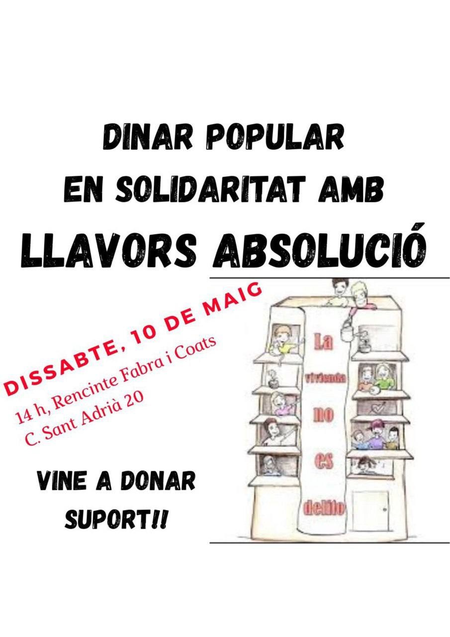 El proper dissabte 10 de maig, en el marc de les Festes de la Primavera de Sant Andreu, s’organitzarà un dinar popular solidari amb les 21 encausades per intentar aturar el desnonament del Bloc Llavors.