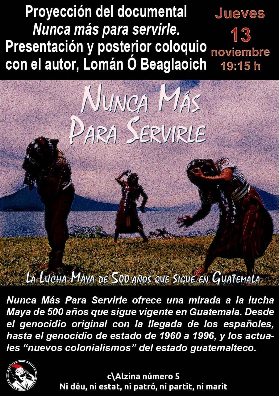 Nunca Más Para Servirle ofrece una mirada a la lucha Maya de 500 años que sigue vigente en Guatemala. Desde el genocidio original con la llegada de los españoles, hasta el genocidio de estado de 1960 a 1996, y los actuales “nuevos colonialismos” del estado guatemalteco.