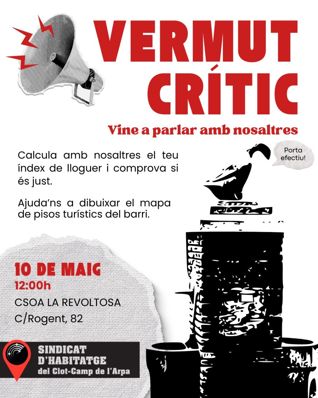 Si tens algun problema relacionat amb l’habitatge o tens dubtes sobre el tema, si t’has preguntat mai què fem, si tens curiositat per saber com ens organitzem, si vols conèixer els teus drets en matèria d’habitatge o si estàs farta del turisme massiu al barri — preus abusius, desnonaments, especulació, pisos buits, falta d’habitatge social… — vine a fer el vermut amb nosaltres i en parlem!