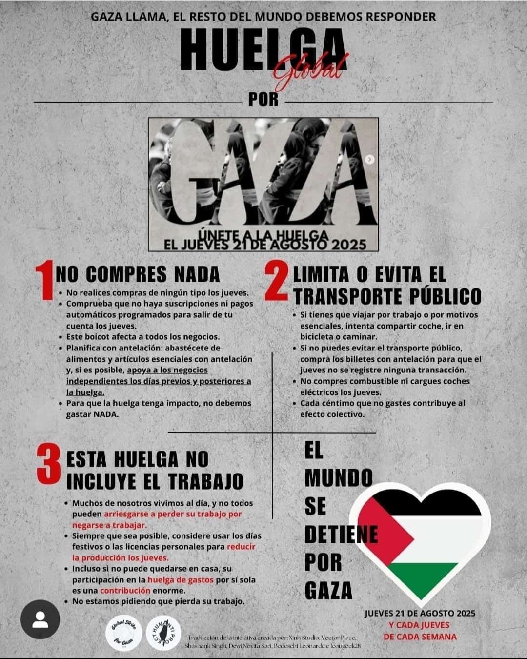 1) No compres nada: No realices compras de ningún tipo los jueves. Comprueba que no haya suscripciones ni pagos automáticos programados para salir de tu cuenta los jueves. Este boicot afecta a todos los negocios. Planifica con antelación: abastécete de alimentos y artículos esenciales con antelación y, si es posible, apoya a los negocios independientes los días previos y posteriores a la huelga. Para que la huelga tenga impacto, no debemos gastar NADA.