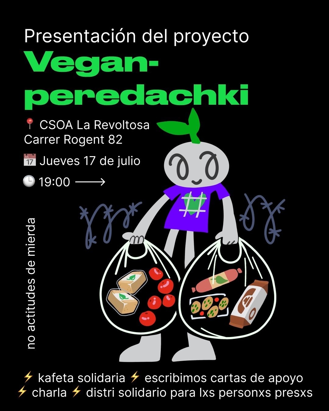 Vegan-peredachki es un proyecto de apoyo a presxs en las prisiones rusas. Desde 2022, el número de presxs políticxs en Rusia ha aumentado, y a raiz de esto nos juntamxs nosotrxs para crear este proyecto.