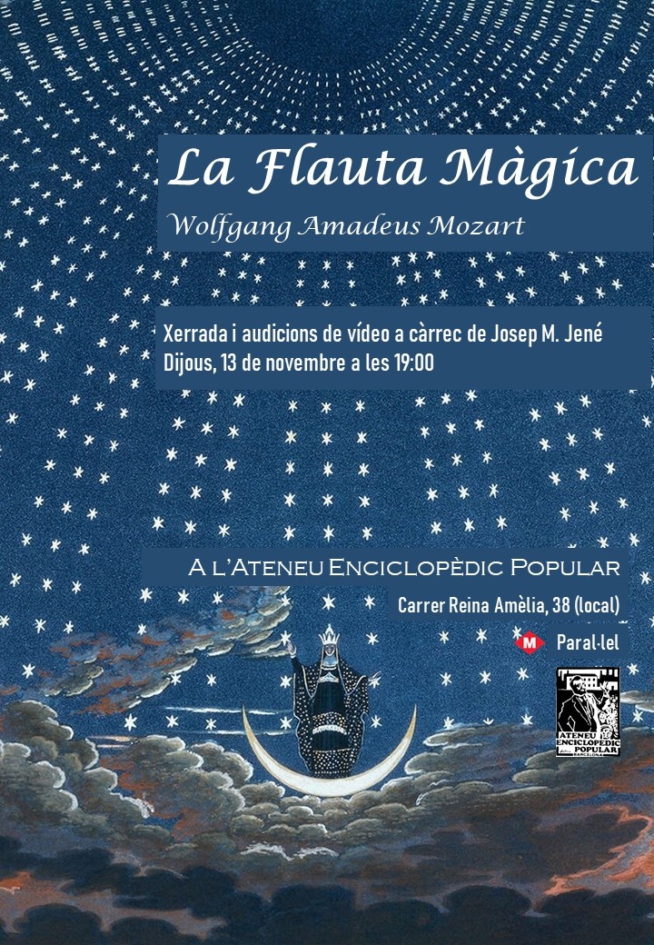 Dijous, 13/11/2025, 19 hores: Continuem amb les sessions d'òpera a l'ateneu, aquesta setmana amb “La Flauta Màgica”, de Wolfgang Amadeus Mozart. Amb xerrada i audició de vídeo comentades per Josep M. Jené