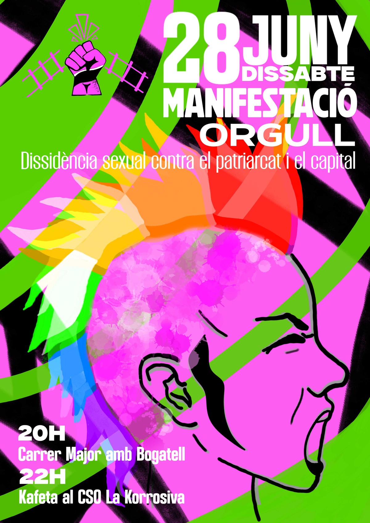 Fem una crida a les persones del poble, unim-nos contra la LGTBIQfòbia, unim-nos contra el patriarcat, per aturar desnonaments, per donar suport a les vagues de les treballadores, per cridar contra la violència i racisme institucional, volem el tancament dels CIEs ja i la regularització de totis!