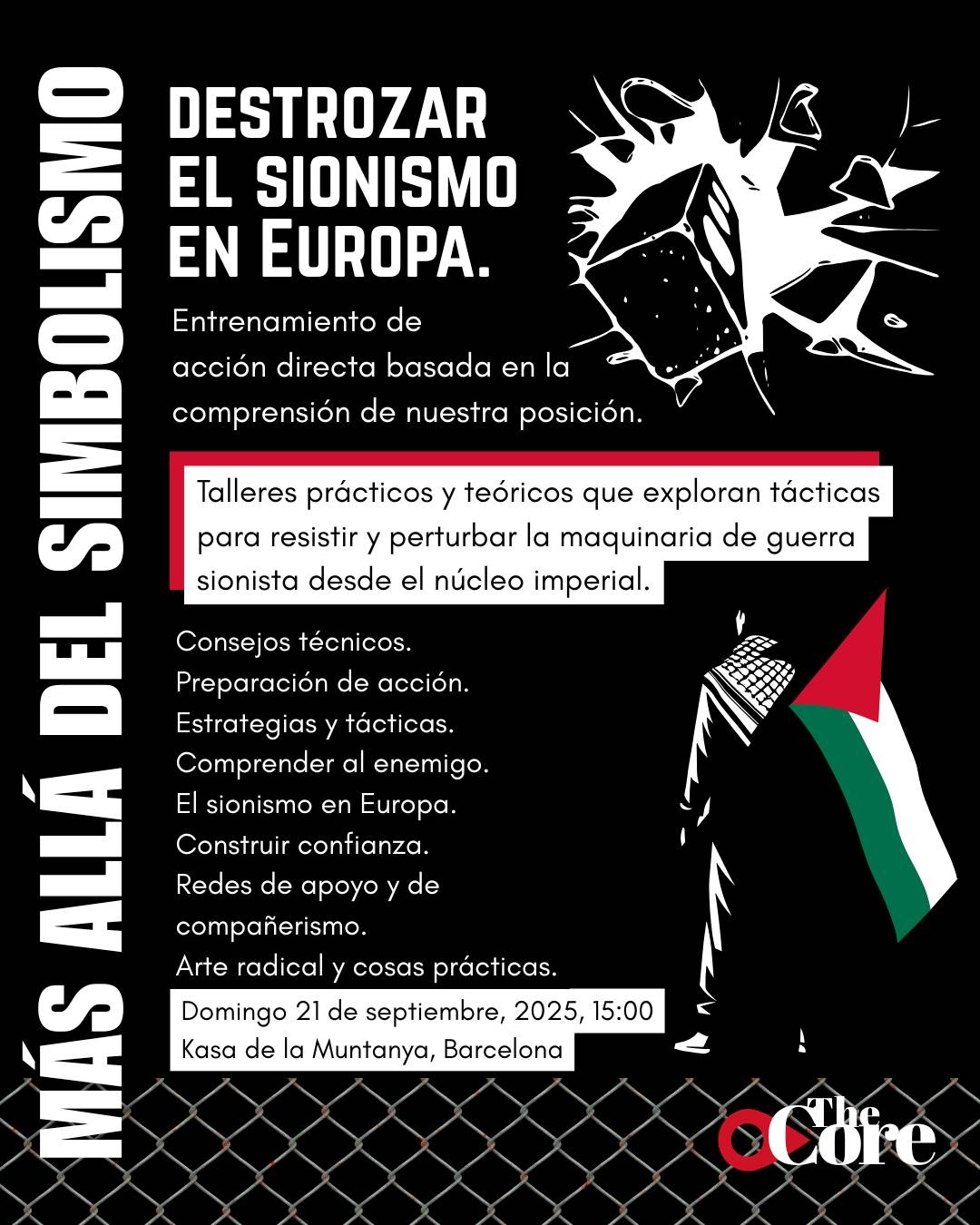 Los elementos prácticos incluirán consejos técnicos para navegar por el panorama digital, consejos para la investigación y preparación práctica de la acción. Los elementos teóricos incluirán el debate sobre estrategias y tácticas de acción directa, la comprensión del enemigo, el sionismo en Europa, la protección contra la represión y ejercicios de reflexión para fomentar la confianza entre compañerxs en nuestras redes y comunidades.
