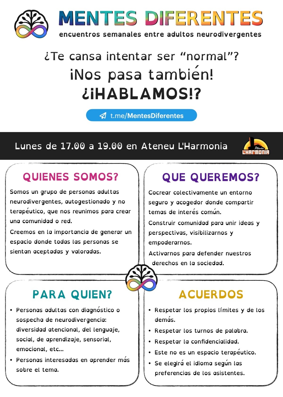 Somos un grupo de personas adultas neurodivergentes, autogestionado y no terapéutico, que nos reunimos para crear una comunidad o red.