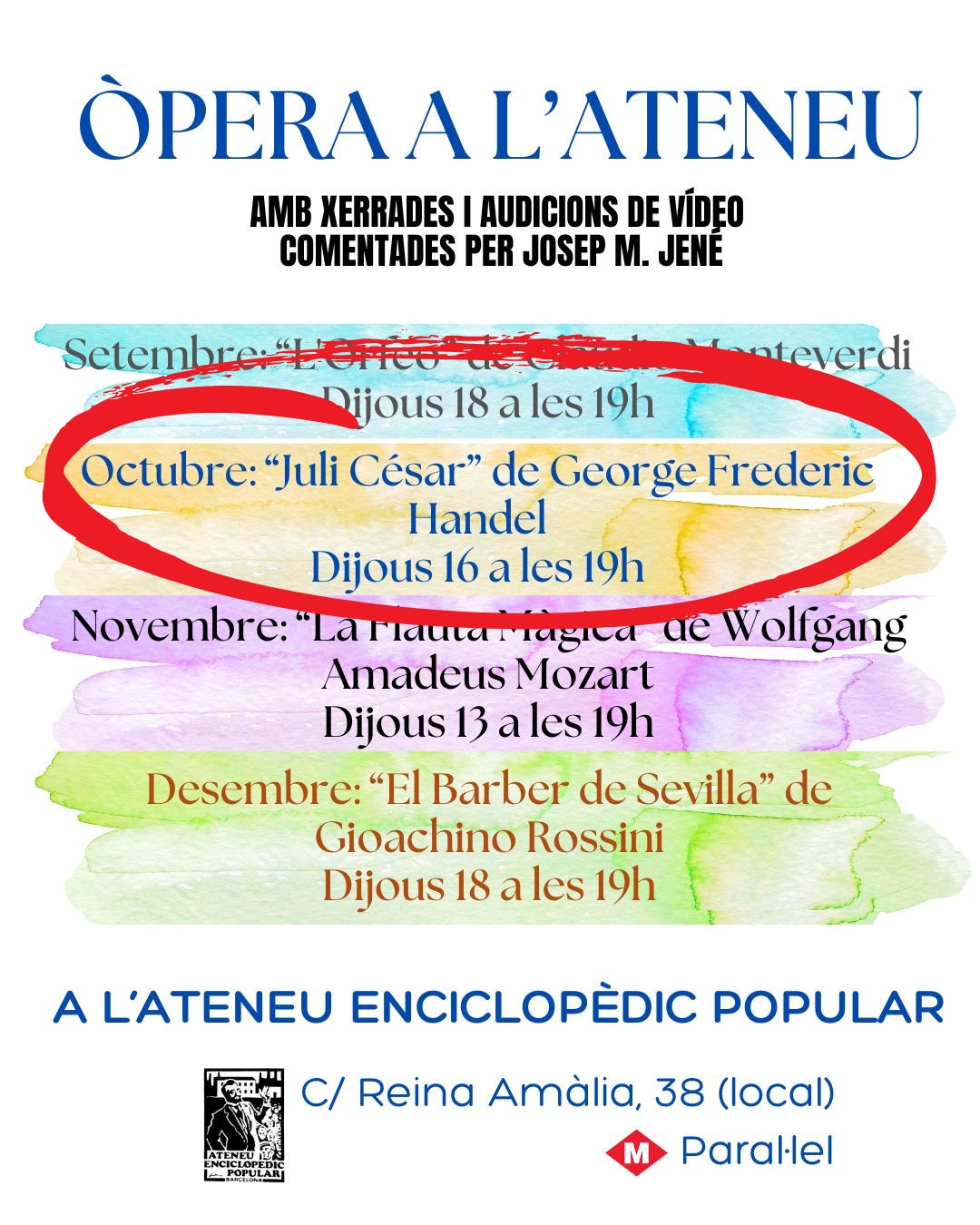 Nova sessió d'òpera a l'ateneu enciclopèdic popular, dijous 16 d'octubre, 19 hores. Aquesta vegada per parlar de “Juli Cèsar”, de George Frederic Handel. Xerrada i audició de video comentada per Josep M. Jené.