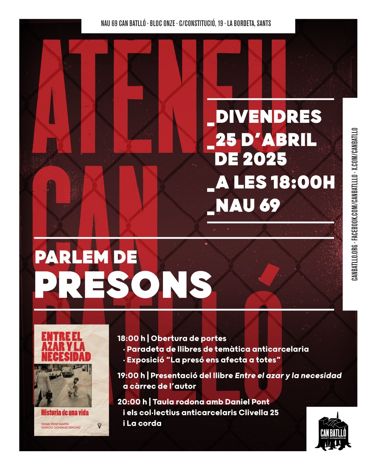 En acabar, taula rodona amb el mateix Daniel i els grups anticarceraris Clivella 25 i La Corda, per a parlar del passat, del present i del futur de les presons i la lluita contra aquestes.