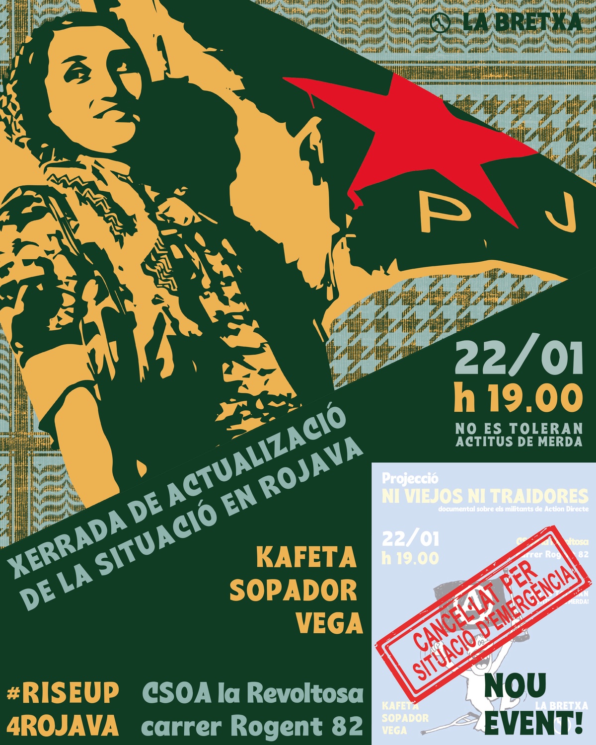 Davant de la situació d'emergència en Rojava hem cancel·lat la projecció que teníem prevista i hem organitzat una xerrada d'actualització sobre la situació actual. El projecte revolucionari de la Confedaració Democratica de la Siria del Nord està en greu perill, sot l'atac de les bandes jihadistes del règim de Jolani. Kobane, símbol de la resistència contra ISIS, és l'epicentre actual de la defensa.