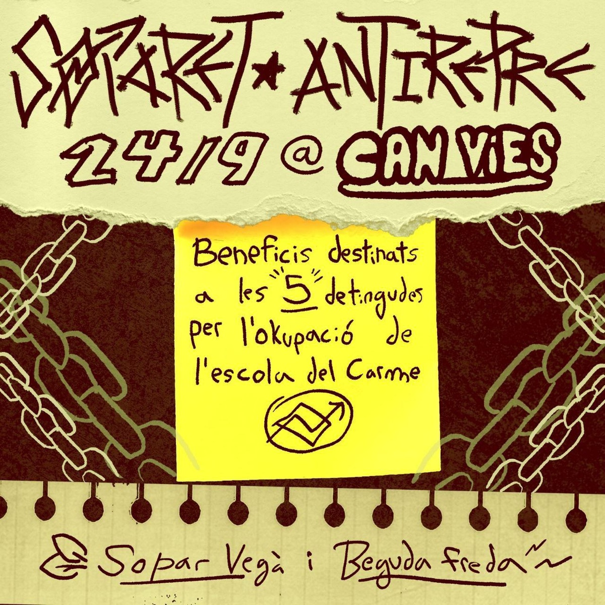 Aquest dimecres 24, a les 21:30, no tenim taller de bicis, però podeu venir al soparet antirepre en el CSA Can Vies.