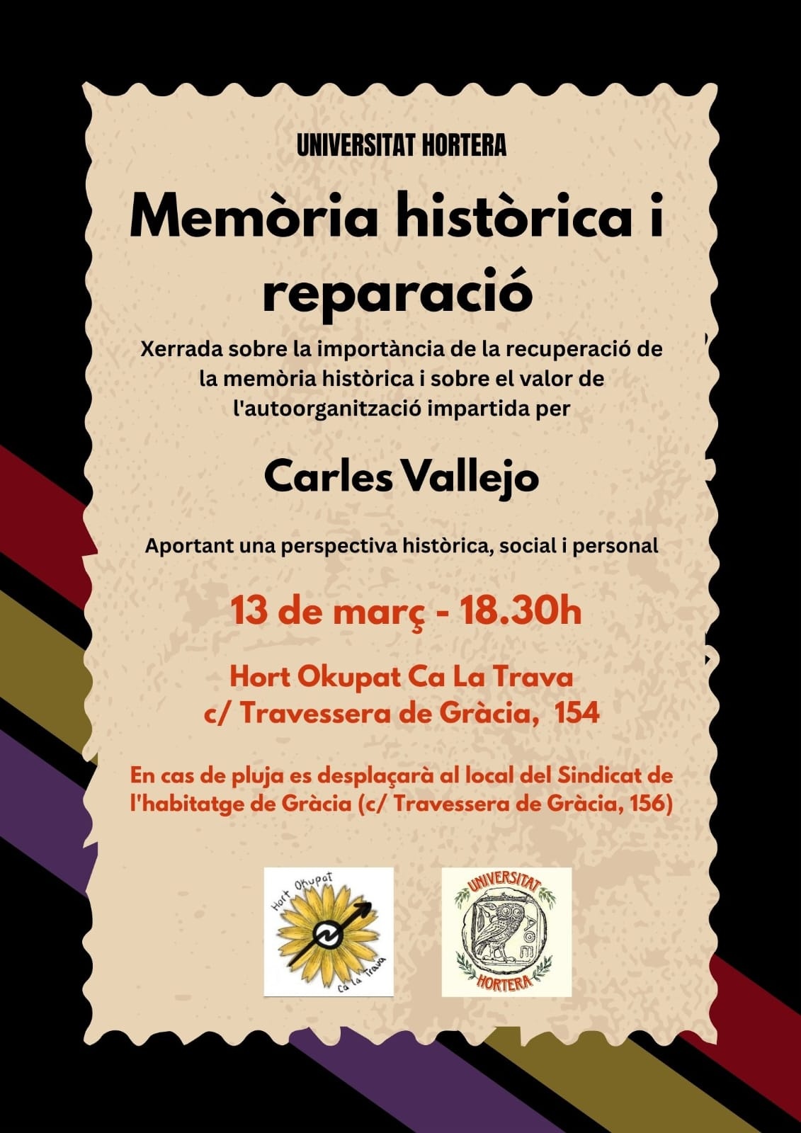 Aquest divendres torna la Universitat Hortera amb una xerrada impartida per Carles Vallejo sobre la importància vers la recuperació i preservació de la memòria històrica i sobre el valor de l'autoorganització des d'una perspectiva històrica, de lluita social i del testimoni del mateix conferenciant. En un format tipus mesa oberta en la que seran benvingudes preguntes i intervencions després de la presentació.