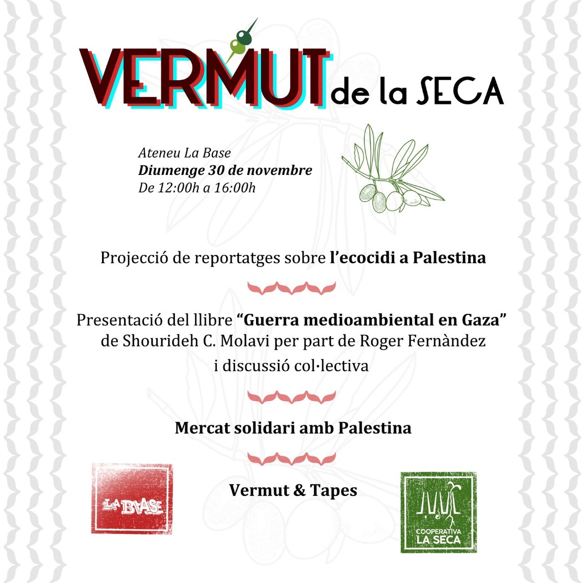 La Cooperativa de consum La Seca (projecte que forma part de l'ateneu La Base) organitza el seu primer Vermut amb la projecció de dos breus reportatges sobre l'ecocidi a Palestina i la presentació del llibre "Guerra medioambiental en Gaza" per part del company de la CGT, Roger Fernàndez, amb posterior discussió col•lectiva.