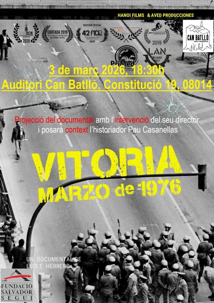 📣 El dimarts 3 de març a les 18.30h, a l’auditori de Can Battló, projecció del documental 'Vitoria marzo de 1976', amb intervencions del seu director, Luis E. Herrero, i de l'historiador Pau Casanellas.