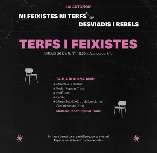 Taula rodona: TERFs i Feixistes Thursday, Jun 26, 06:30 PM Ateneu del Clot 16, Carrer de la Muntanya, el Clot, Sant Martí, Barcelona, Barcelonès, Barcelona, Catalunya, 08026, España 28J28JAutònom28Juny2025ClotLGBTIQA+RedTrans