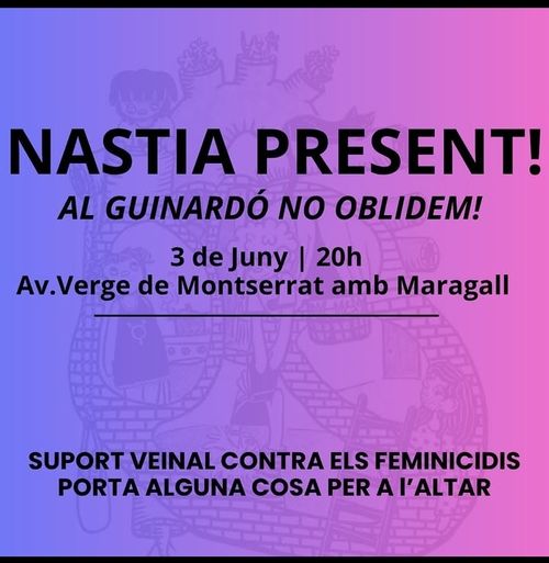 Per Nastia, contra els feminicidis Tuesday, Jun 03, 08:00 PM Passeig Maragall amb Mare de Déu de Montserrat Passeig Maragall amb Mare de Déu de Montserrat, Barcelona HortaProu feminicidisconcentraciótransfeminisme