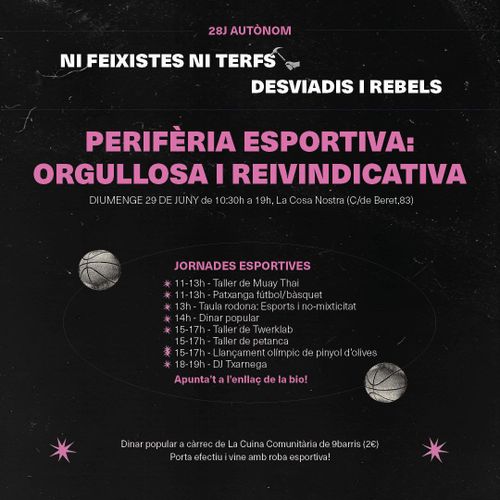 Perifèria esportiva: orgullosa i reivindicativa Sunday, Jun 29, 10:30 AM-07:00 PM Sunday 29 June 19:00 Casal de barri La Cosa Nostra Carrer de Cornudella, Can Peguera, Nou Barris, Barcelona, Barcelonès, Barcelona, Catalunya, 08031, España 28J28JAutònom28Juny2025LGBTIQA+NouBarrisPD