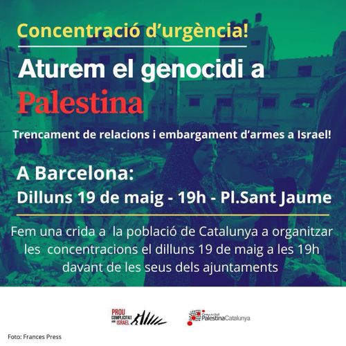 Concentració d’urgència. Aturem el genocidi a Palestina Monday, May 19, 07:00 PM-08:30 PM Monday 19 May 20:30 Plaça de Sant Jaume Plaça de Sant Jaume