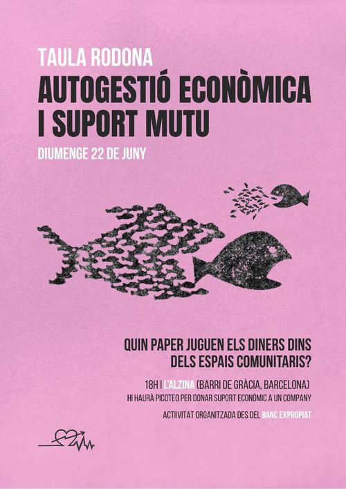 Taula Rodona: Autogestió econòmica i suport mutu Sunday, Jun 22, 06:00 PM-09:00 PM Sunday 22 June 21:00 Jardí de L'Alzina c/ Manrique de Lara BancExpropiatGràciaautogestiótaularodona
