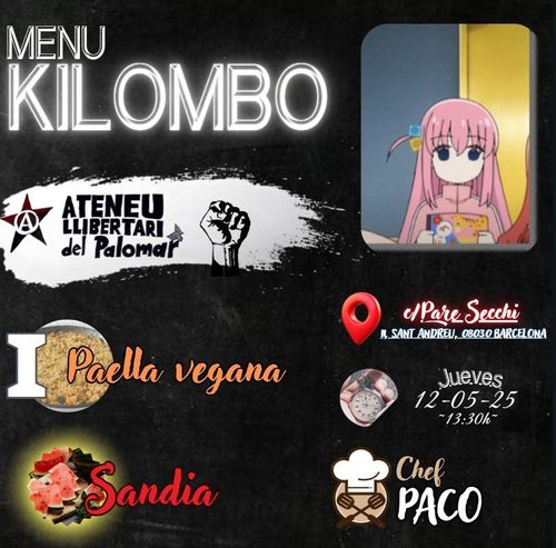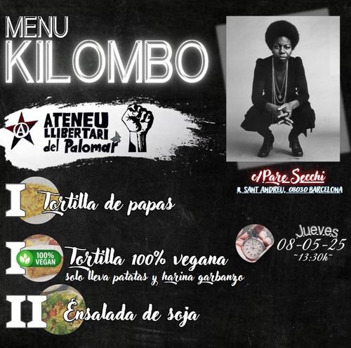 Menjador: Kilombo Thursday, Oct 09, 01:30 PM-04:00 PM Thursday 9 October 16:00 Ateneu Llibertari del Palomar 11, Carrer del Pare Secchi, Sant Andreu de Palomar, Barcelona, 08030 SantAndreuautogestiódinarVegà