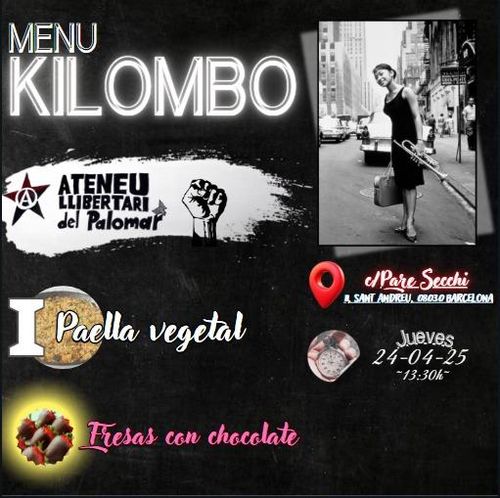 Menjador Kilombo Thursday, Nov 06, 01:30 PM-04:00 PM Thursday 6 November 16:00 Ateneu Llibertari del Palomar 11, Carrer del Pare Secchi, Sant Andreu de Palomar, Barcelona, 08030 SantAndreudinarVegà