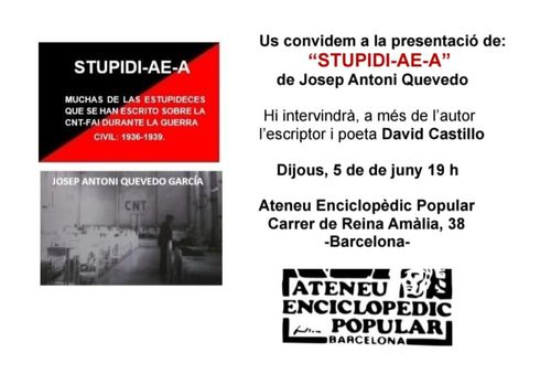 Presentació del llibre 'La pequeña historia. Crónicas de lucha obrera y exilio de un anarquista' a l'Ateneu Enciclopèdic Popular. Friday, Nov 14, 07:00 PM-09:00 PM Friday 14 November 21:00 Ateneu Enciclopèdic Popular de Barcelona 38, Carrer de la Reina Amàlia, el Raval, Barcelona, 08010 exili anarquista