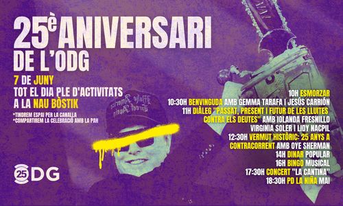 Aniversari 25 anys ODG Saturday, Jun 07, 10:00 AM-09:00 PM Saturday 7 June 21:00 Nau Bostik Carrer del Pont del Treball Digne, la Sagrera, Barcelona SagreraSantAndreuaniversaribingo musicalmonoleg