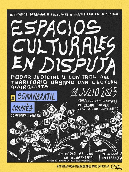 Espacios culturales en disputa Friday, Jul 11, 06:00 PM-12:00 AM Saturday 12 July 00:00 CSO La Squatxería 88, Carrer d'Enric Prat de la Riba, Sant Josep, l'Hospitalet de Llobregat, 08901 BancExpropiatCharla debateLHospitaletSquatxeríaautogestióconcert