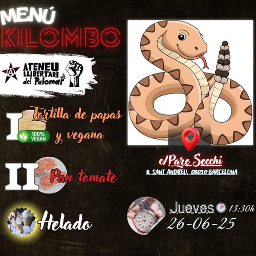 Menjador Kilombo Thursday, Oct 30, 01:30 PM-04:00 PM Thursday 30 October 16:00 Ateneu Llibertari del Palomar 11, Carrer del Pare Secchi, Sant Andreu de Palomar, Barcelona, 08030 SantAndreuautogestiódinarVegà