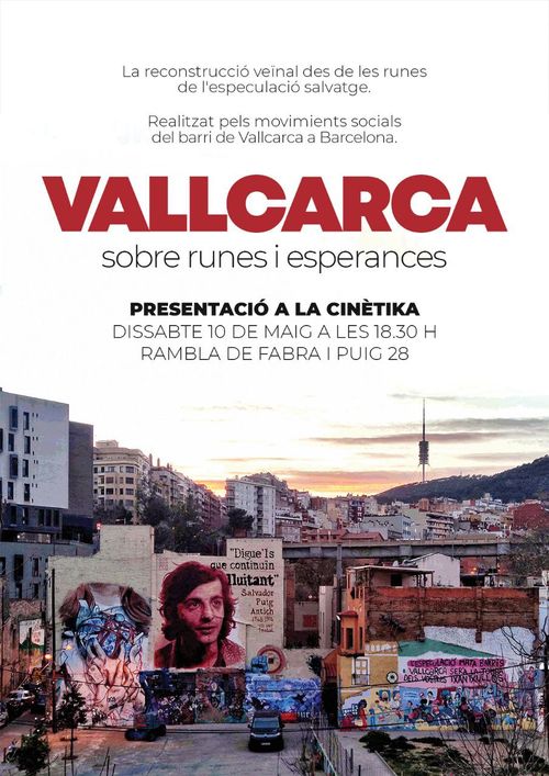 Estrena del Documental "Vallcarca sobre runes i esperances" + debat Saturday, May 10, 06:30 PM-09:00 PM Saturday 10 May 21:00 La Cinètika 32, Rambla de Fabra i Puig, Sant Andreu, Barcelona, 08030 Vallcarcadocumentalestrena documental