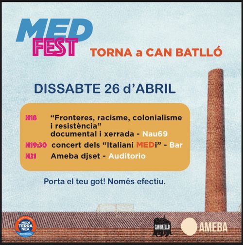 MedFest Saturday, Apr 26, 06:30 PM-02:00 AM Sunday 27 April 02:00 Can Batlló 19, Carrer de la Constitució, la Bordeta, Barcelona, 08014 Charla debateSantsautogestióelectrònicaestrena documentalmúsica