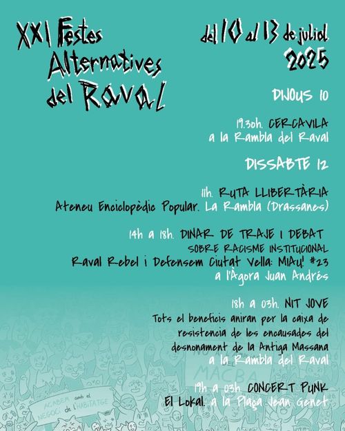 Festes Alternatives del Raval Thursday, Jul 10, 12:00 PM → Saturday, Jul 12 Saturday 12 July 02:00 Rambla del Raval la Rambla del Raval, Barcelona Ravalconcertfestes del raval