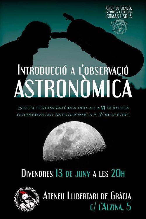 Taller d'introducció a l'observació astronòmica Friday, Jun 13, 08:00 PM-10:00 PM Friday 13 June 22:00 Ateneu Llibertari de Gràcia 5 B2, Carrer de l'Alzina, Gràcia, Barcelona, 08024 Gràciaastronomíataller ciència