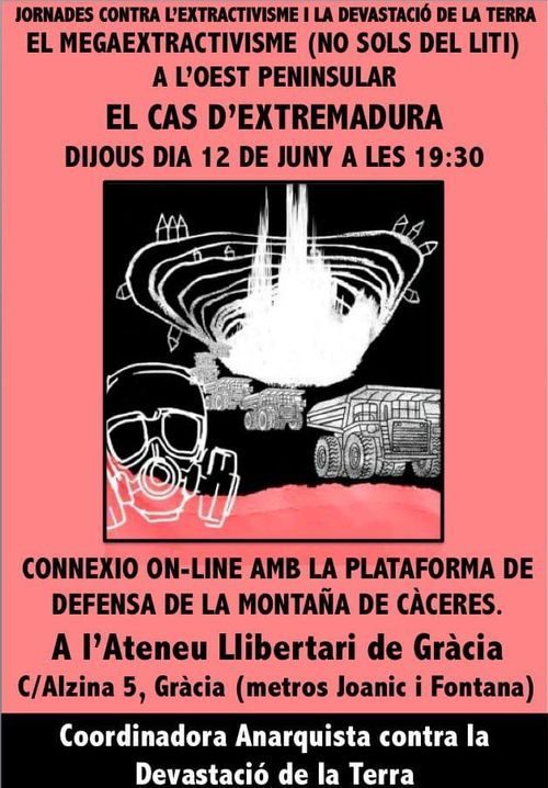 " Jornades contra l'extractivisme i la devastació de la terra", Xerrada conferència on-line amb la lluita contra les mines de liti a El Rebollar (Extremadura) Thursday, Jun 12, 07:30 PM-09:30 PM Thursday 12 June 21:30 Ateneu Llibertari de Gràcia 5 B2, Carrer de l'Alzina, Gràcia, Barcelona, 08024 Gràciajornades contra l'extractivisme i la devastació de la terravideollamadaxerrada